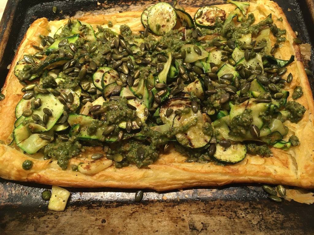 Charred courgette and pesto tart – recipe from Katy Beskow. Lovely warm spring evening supper! I made the pesto with sunflower seeds, rather than the almonds suggested, as child #1 is nut allergic.