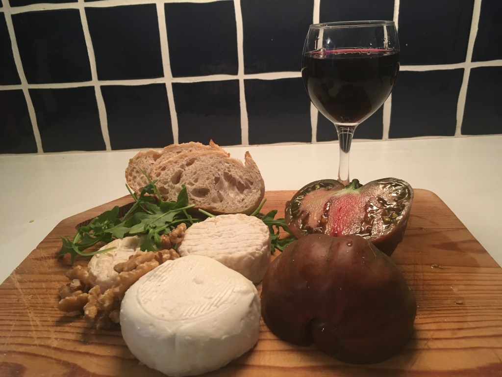 A triplette de fromages purchased in a market in Lambesc – chèvre dur, chèvre doux, chèvre nature, with a local tomato and a glass of Bandol red.