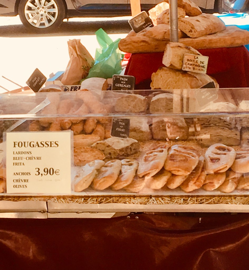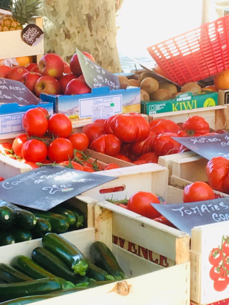 There is another side to this coin, however. What they do have in abundance here in the south are markets selling local produce, les marchés paysans or du terroir. It has been a delight meandering through streets vibrant with colours and odours – saucissons secs, cheeses, fruit, veg and fish etc. Very few bargains to be found, but some of the best strawberries and tomatoes I have tasted in a long time – we also found some delicious swordfish, a brique de brebis (ewe’s cheese that was fresh as….) and some local honey – Miel de Garrigues, infused with aromas of rosemary and thyme…. Morning purchases lead to happy lunchtime and evening eating!