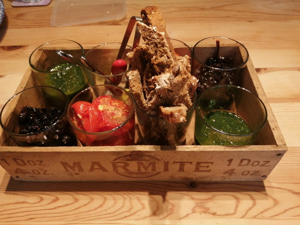 Drinking: Too much as usual, but enjoying plenty of local rosé. This one was very dry and went down a treat with the ‘planche de tapas’ we ordered, which included chorizo cookies, a tuna and cream cheese dip, marinaded red peppers, a courgette and goat’s cheese cake and a cumin and chick pea tart – apologies for the rather poor quality photo…