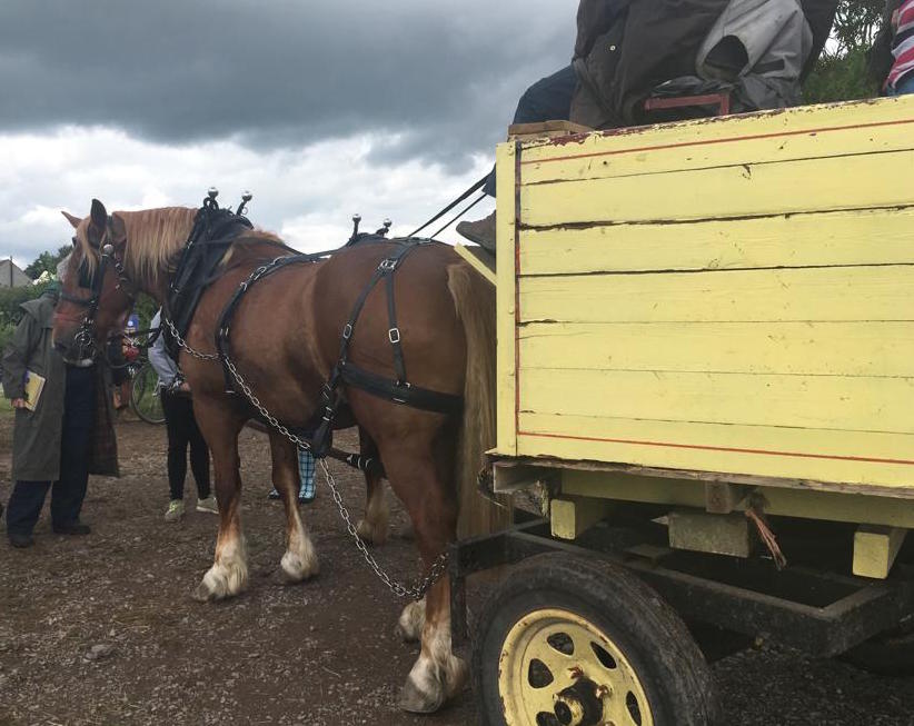 Since our return from France,there have been a plethora of adverts for festivals amongst the now verdant hedgerows – more jazz and folk music than you can shake the proverbial (drum)stick at. So what would our first one be like? An unpromising start – meeting in a run-down car park at the back of town, clouds menacing overhead accompanied by a stiff breeze, was brightened by the cheery greetings from our party and the appearance of flower garlands for hats and heads. What followed was a solar powered boat trip on the river; ‘motley’ would be the best word to describe the crew, or perhaps ‘eccentric’ or rather ‘interesting’. Gliding along the stream peacefully, we were treated to a very different view of familiar countryside. Next step of the trip was a carriage, drawn by a pair of Suffolk Punch horses; travelling through the country lanes to the festival ground, past the semi-derelict abbey, we delighted in holding up the traffic as the world clip-clopped by.