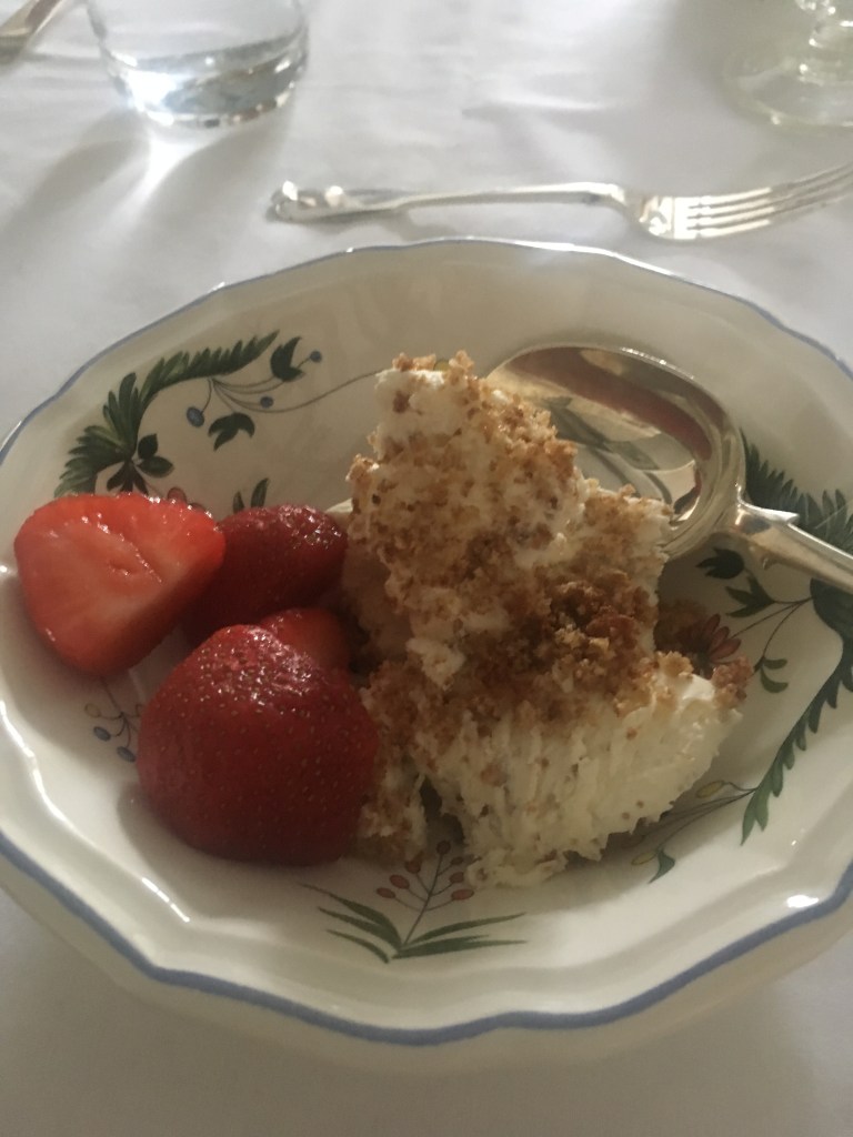 Eating: Brown bread ice cream and strawberries, with extra toasted sprinkles. Breadcrumbs toasted with some dark brown sugar to caramelise prior to adding to the custard and churning.