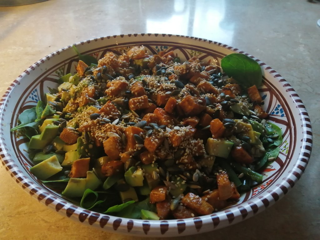 Eating: Given the current warm spell, salads have been on my mind, but with child#1 working full time and ‘needing’ a filling meal, I found a recipe for an avocado salad which ticked all the boxes…the sweet potato (roasted in cumin) giving it ‘heft’, the seed sprinkle ‘texture’, the green beans ‘freshness’, the feta ‘saltiness’ and the honey and soy dressing a nice ‘kick’. Recipe from March edition of Veggie magazine.