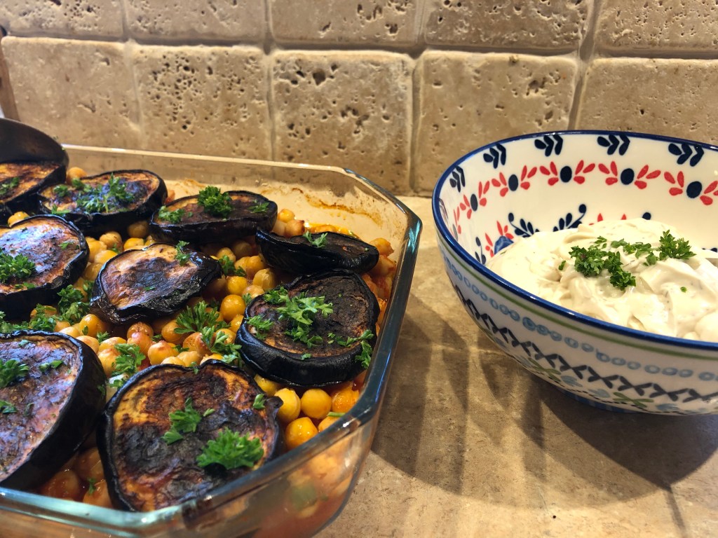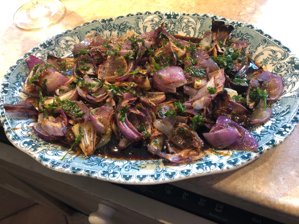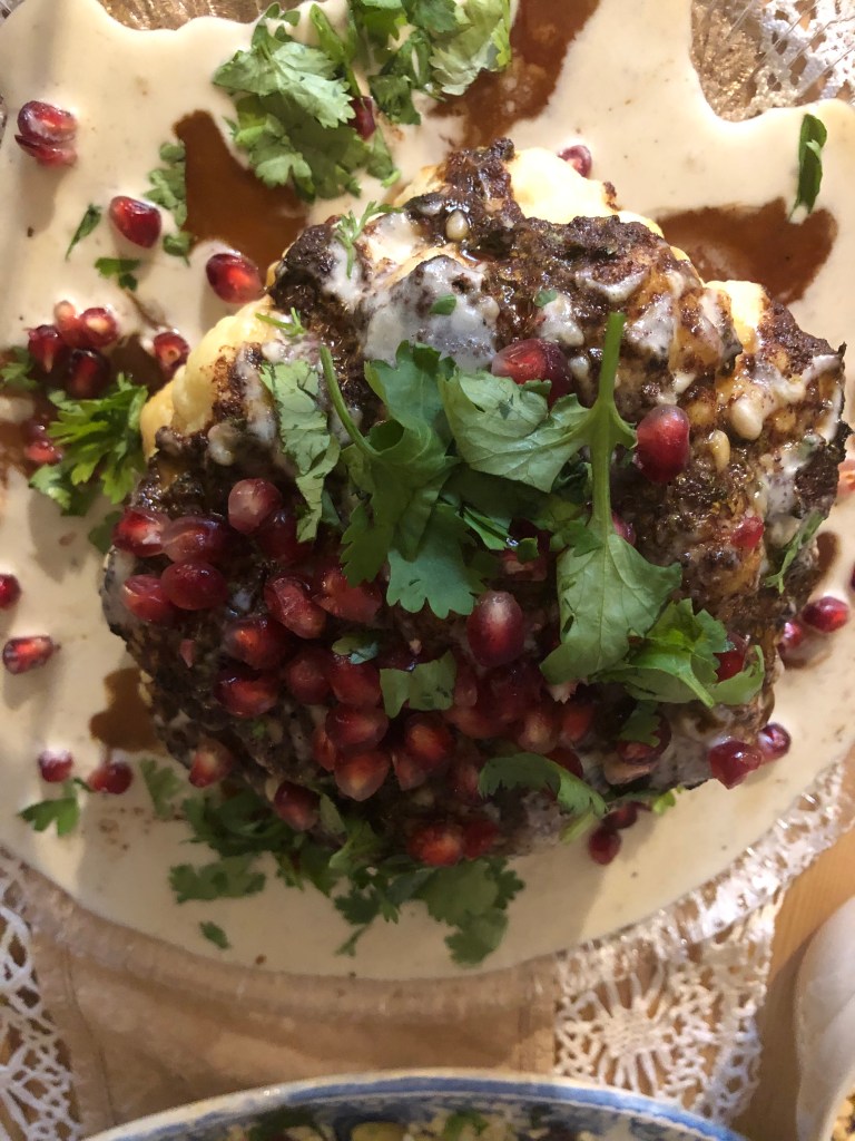 Eating: Preserved lemons and pomegranate were two of the flavours that my mother remembered, so we had variety of dishes – sweet and sour onion petals (recipe from Ottolenghi in Feast 06/19), cauliflower shawarma (recipe from Josh Katz – Berber & Q), Chermoula aubergine with bulgar and yoghurt (recipe from Ottolenghi in The Guardian 01/09/12) and Freekeh, tomato and chickpea pilaf (recipe from Sabrina Ghayour in Vegetarian Living magazine). Apologies, but we were too busy eating to take a picture of the pilaf!