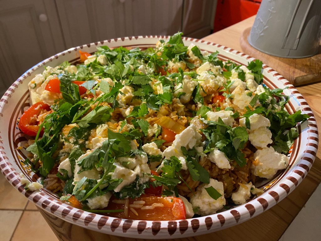 Eating: Red rice with feta and coriander. Recipes from Ottolenghi in The Guardian last weekend. It had a paella feel to it. I made my usual FODMAP amendments and added more feta than the recipe asked for, and probably more coriander, as we all love it!